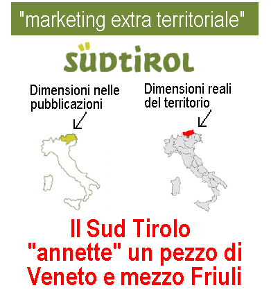 Infatti, la piantina dell’Alto Adige, per dare più visibilità al territorio alto-atesino è stata allargata fino ad “annettere” un pezzo del Veneto (tutto il bellunese e parte del trevigiano) e mezzo Friuli. Secondo questa piantina l’Alto Adige considera già annesso il territorio bellunese?